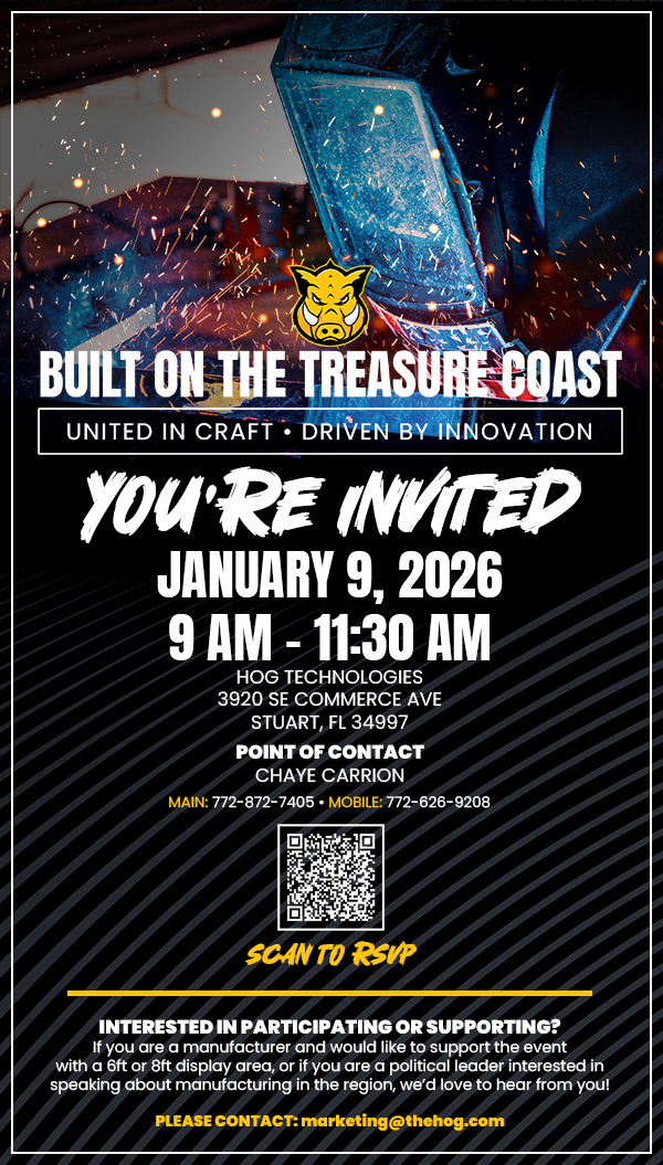 This event brings together manufacturers, educators, skilled trades professionals, and community leaders right before government officials return to session. It’s the perfect moment to highlight the innovation, craftsmanship, and career pathways that define the Treasure Coast and greater South Florida region.