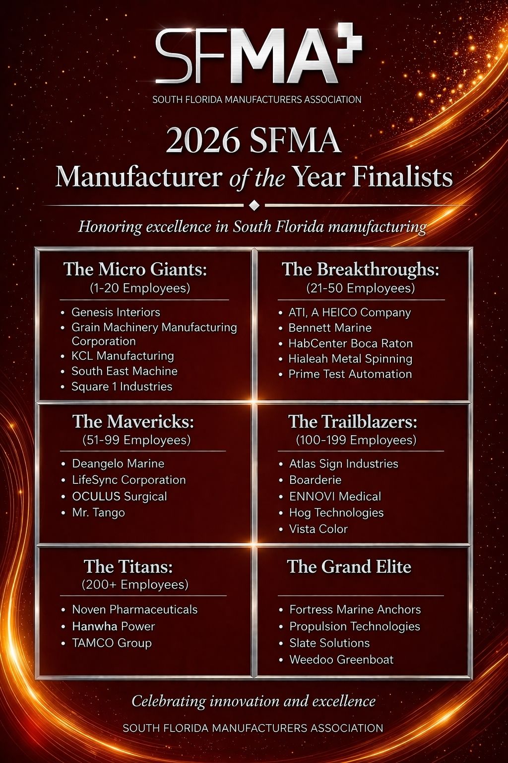 Get ready to witness the grandeur of the South Florida Manufacturer Association’s Recognition of Excellence Ceremony, where we don’t just signify and celebrate – we elevate excellence in manufacturing to new heights. Our judges are manufacturing experts and industry influencers who generously volunteer over 600 collective hours of their time. Get ready to be awestruck as we honor excellence in manufacturing like never before!